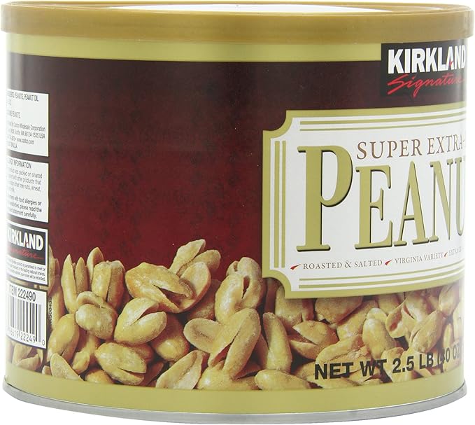 Kirkland Signature Super Extra-Large Peanuts are roasted in peanut oil and lightly tossed in salt to achieve a superior taste and texture. Virginia variety peanuts are packaged in the U.S.A in a re-sealable tin to keep them whole during transport and to ensure that the nuts retain their freshness once opened at home.